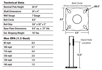 Round Straight Steel Galvanized Light Poles 24′ x 4" x 7G